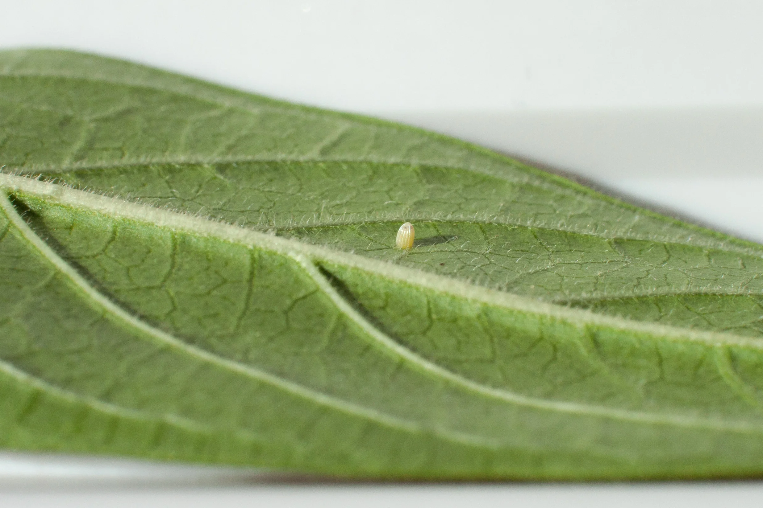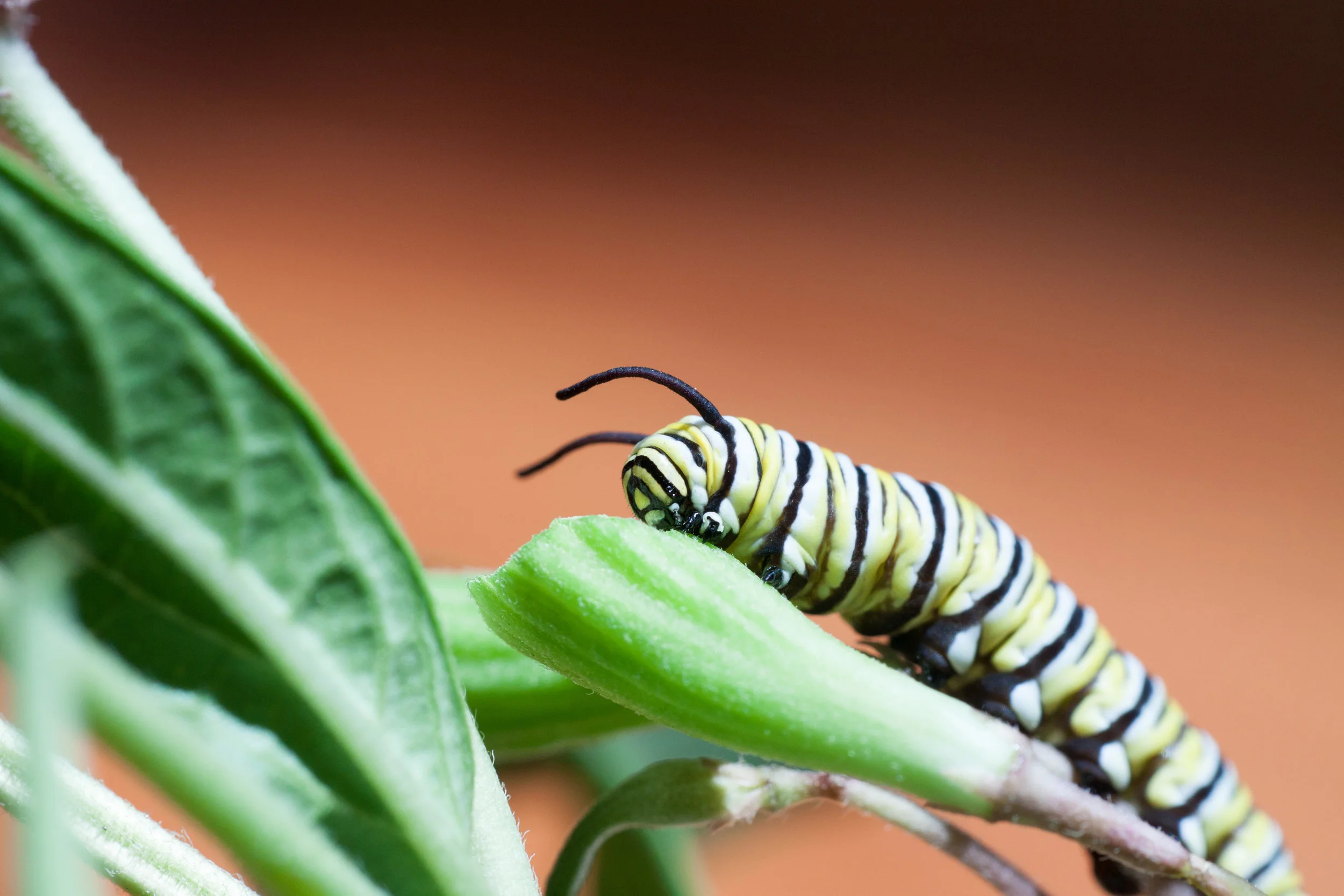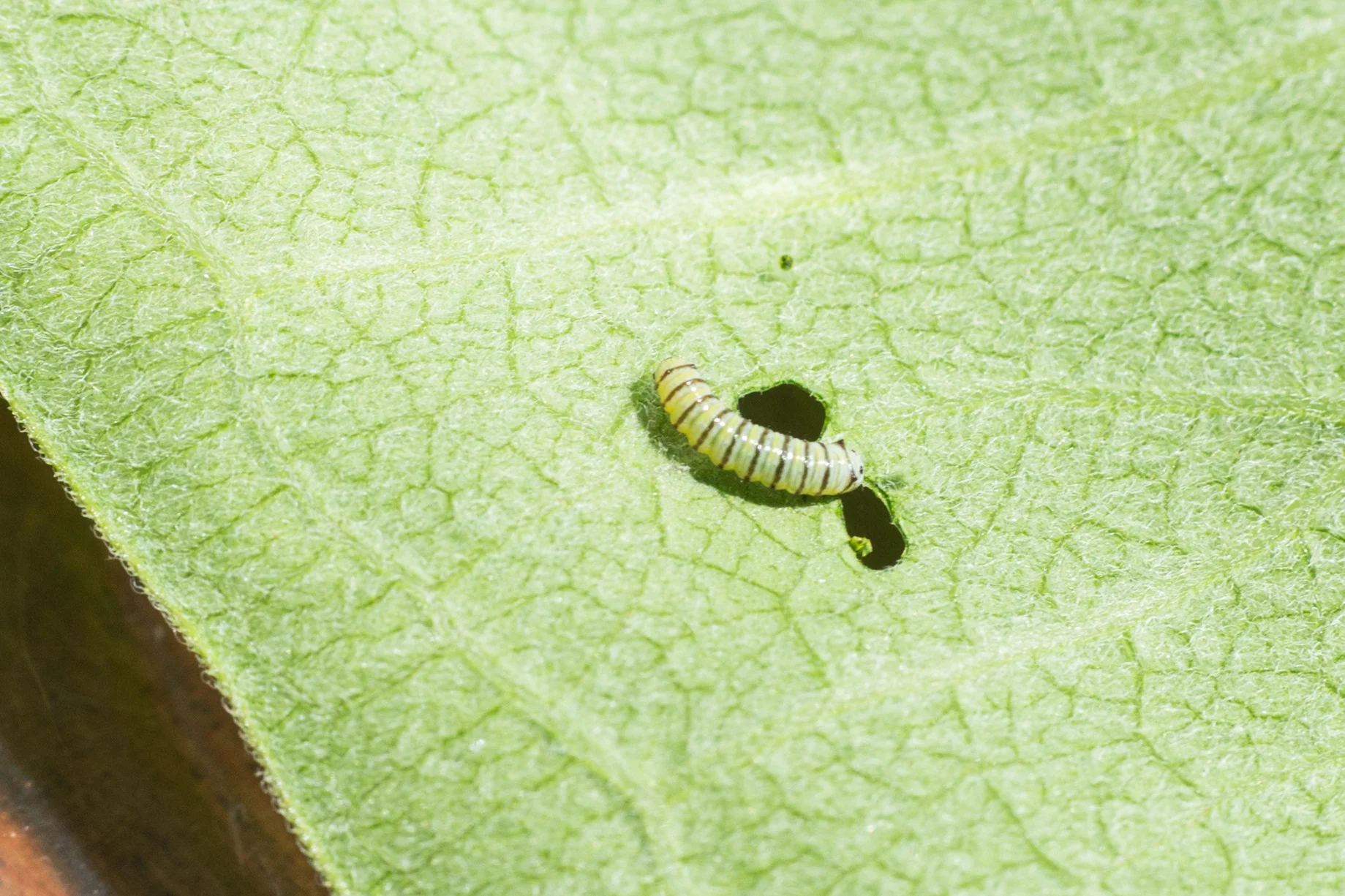 The female monarch lays her eggs on the undersides of the leaves of the milkweed plant. Four days later it hatches.